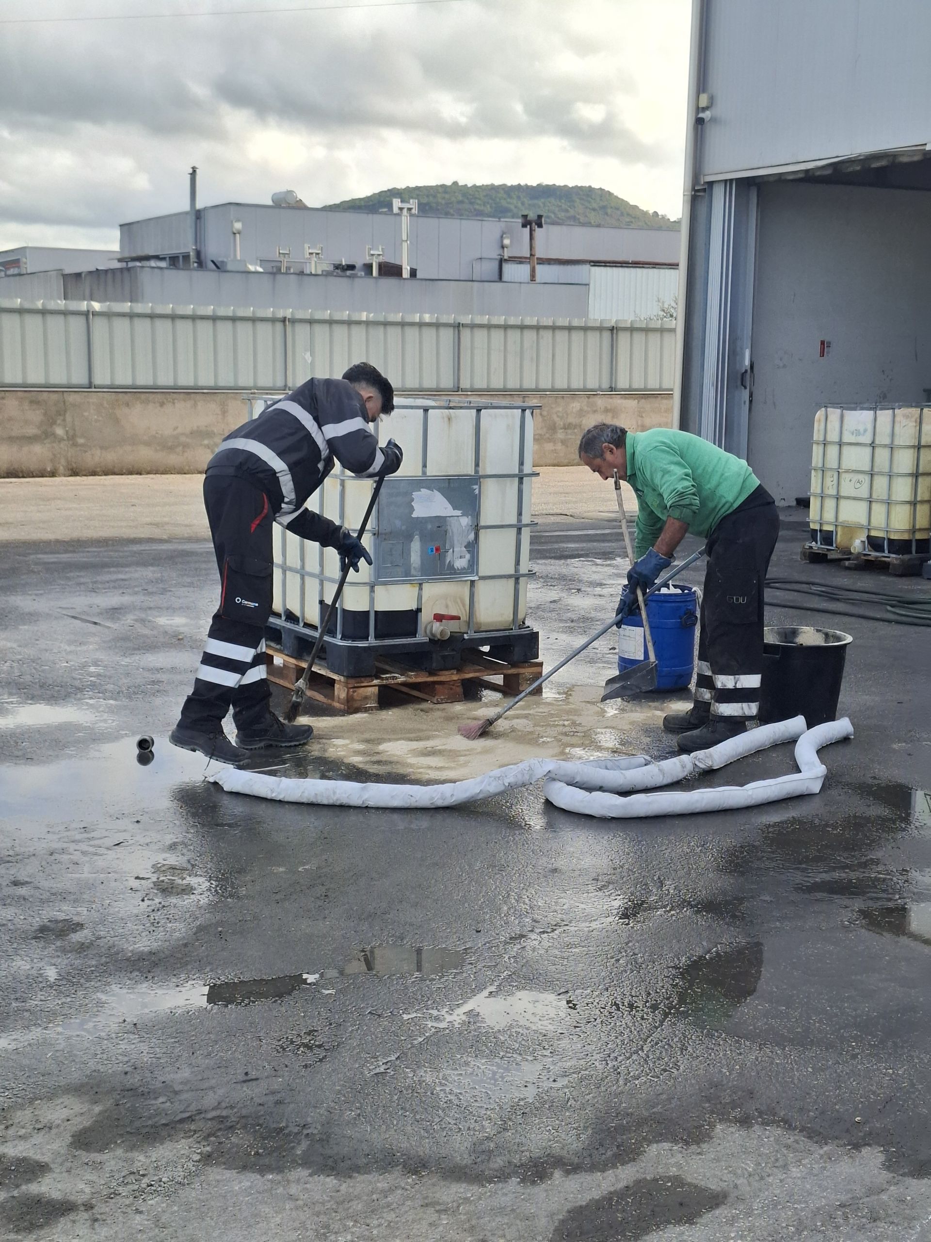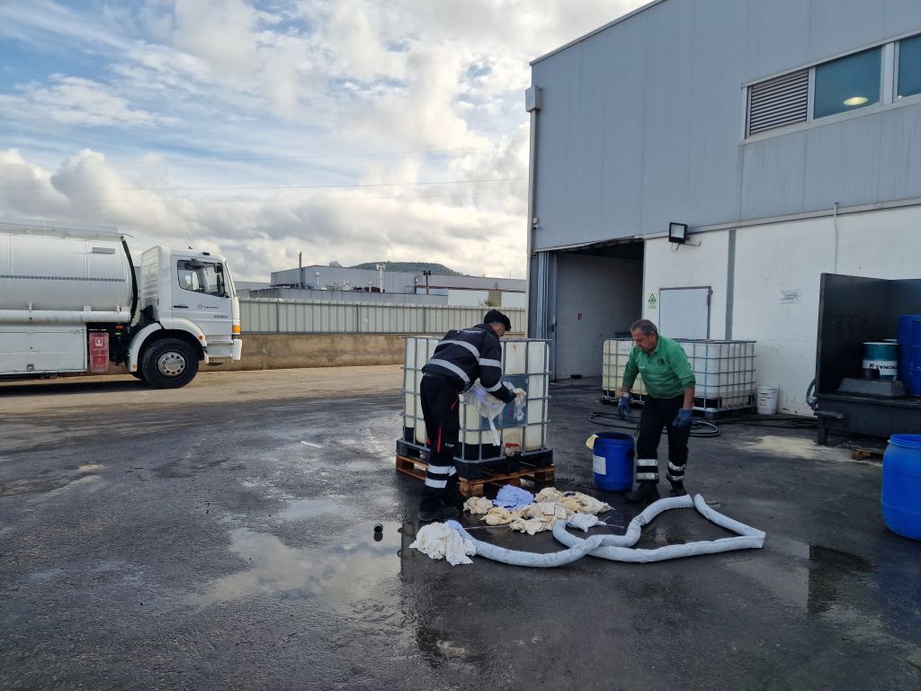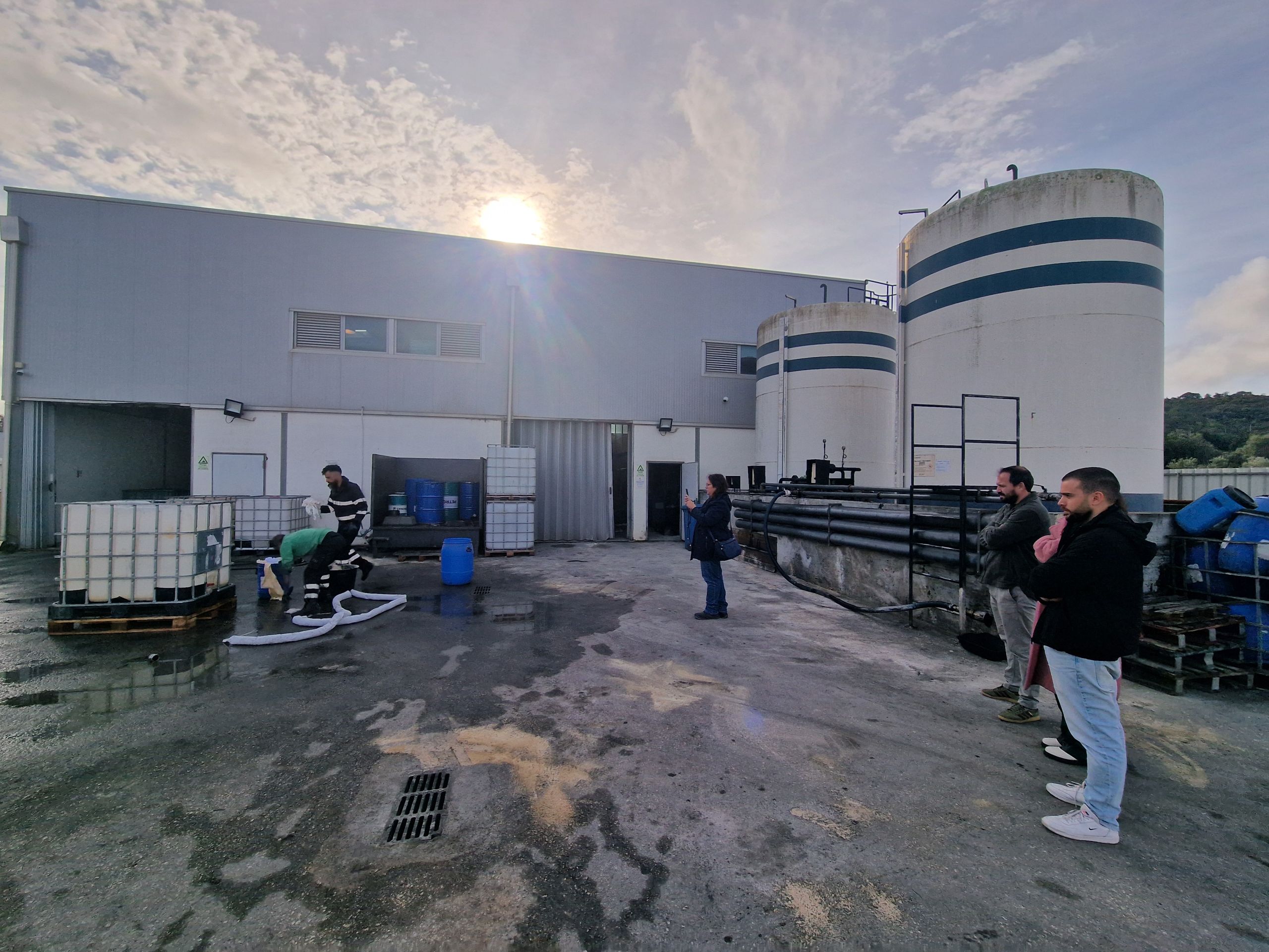 Neste caso, o cenário apresentado consistiu num derrame de óleo usado (OU), por rotura de reservatório/GRG no parque de armazenamento. Após detetado derrame de OU (simulação com água) por rotura de um GRG pela equipa operacional, é de imediato dado o alerta para a restante equipa operacional, que dá início à operação de intervenção com a colocação de uma barreira de contenção com material absorvente, para evitar a propagação do derrame. Depois começa a ser colocado material absorvente para permitir a limpeza e recolha do resíduo gerado para reservatório adequado. Por fim, é reposta a “normalidade” e a situação de origem.